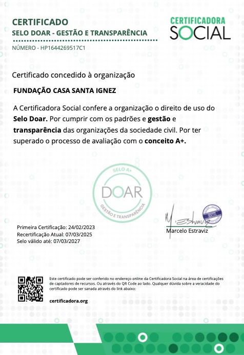 Desde 1919, a Casa Santa Ignez desempenha um papel fundamental na vida da população das Comunidades da Rocinha e Parque da Cidade, no Rio de Janeiro, desenvolvendo talentos e ajudando a transformar as vidas e o curso da história de inúmeras crianças. Um casarão centenário em meio a uma das áreas mais verdes da capital carioca, no bairro da Gávea, recebe diariamente cerca de 250 meninos e meninas, em uma bem estruturada creche e no contraturno, oferecendo apoio educacional e providenciando as mais básicas necessidades.